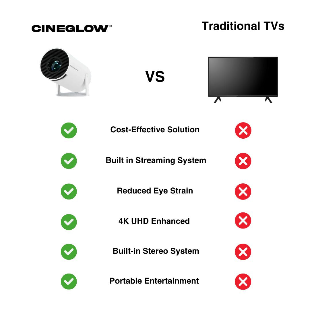 CineGlow outshines traditional TVs with built-in streaming, 180° swivel projection, and true portability—entertainment, anywhere you want it.