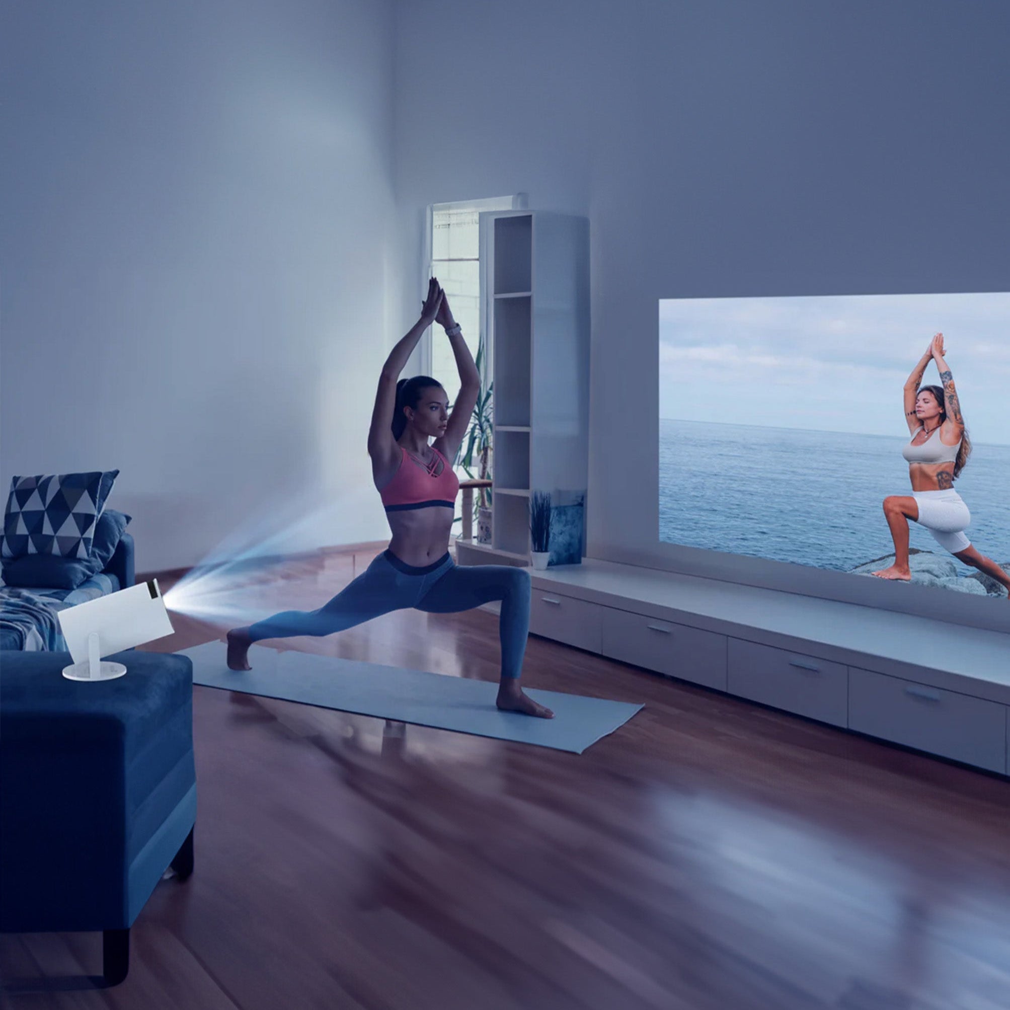 Create your personal wellness retreat anywhere. The CineGlow brings your favorite yoga sessions and fitness programs to life, projecting them onto any space. Perfect for maintaining your routine at home or while traveling.